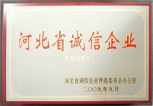 2009年9月,我公司被河北省誠信企業(yè)評(píng)選委員會(huì)評(píng)為“河北省誠信企業(yè)”,并被收入《河北誠信企業(yè)建設(shè)成果集》。證書及獎(jiǎng)牌于近日發(fā)放到公司。